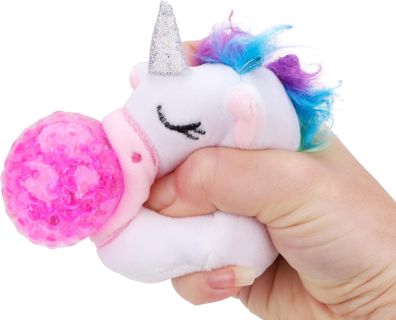 A squeeze toy with a difference. Inside are pink water beads and outside is a plush, soft unicorn. Great stress relief toy, fidget toy or just for fun toy!